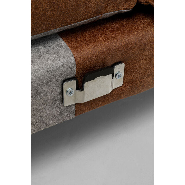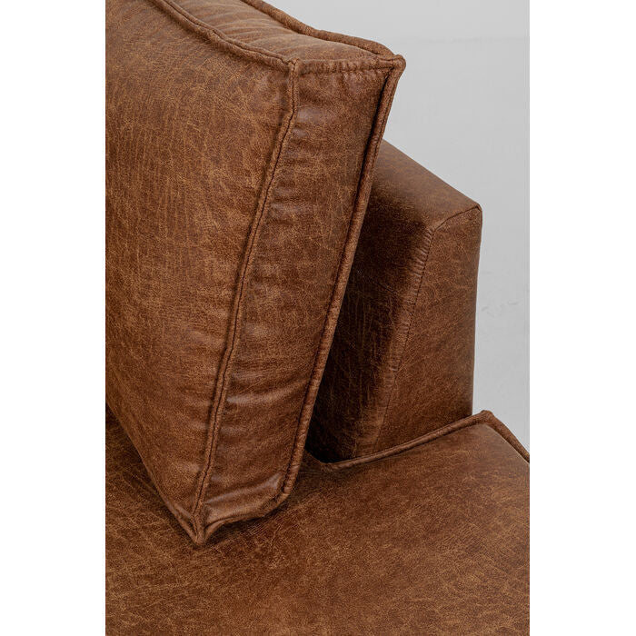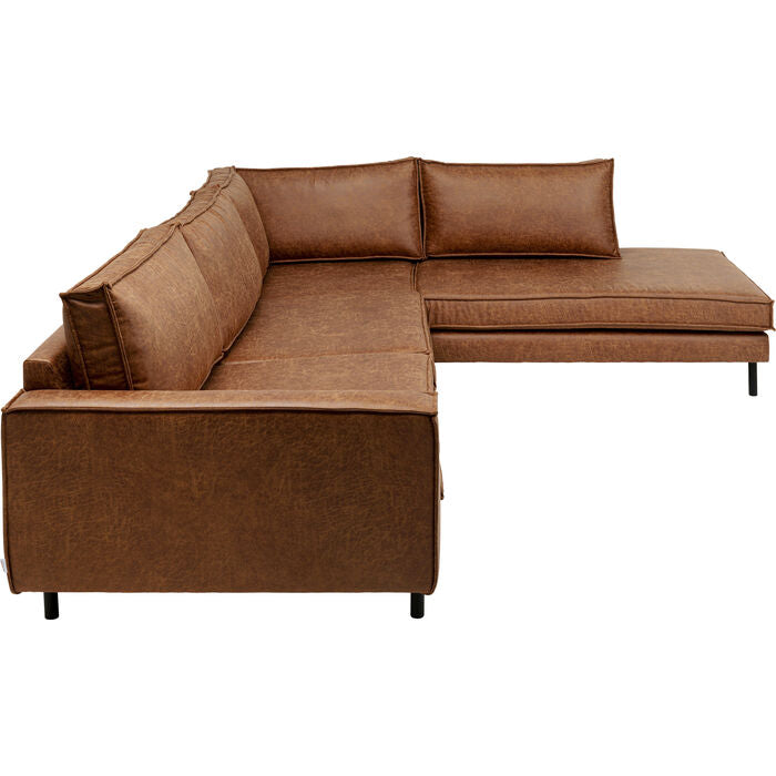 A real statement for any living room: this brown corner sofa in a sophisticated leather look combines clean lines with a luxurious vintage aesthetic. The generous chaise longue not only offers plenty of space for relaxation, but also adds a stylish accent to the room. Thanks to the Nosa spring base and high-quality foam upholstery, it is particularly comfortable to enjoy. The slim, black steel legs give the sofa a delicate, modern look that can be effortlessly integrated into industrial, mid-century or loft interiors. A piece of furniture that impresses with its minimalist design as well as its practical benefits - perfect in combination with robust wooden elements or clearly structured furniture.