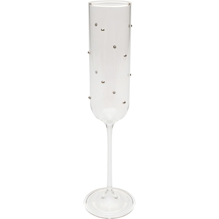 A real gem for the dining table - this drinking glass enchants with fine, silver dots that give the clear glass a gently glamorous touch. The delicate ornament shimmers discreetly in the light and turns every drink into a stylish moment of enjoyment. With its elegant look, the glass is suitable for both festive table settings and modern everyday settings. It looks particularly elegant in combination with linen, natural materials or accessories in brass or black. A small eye-catcher with a big impact - perfect for adding that certain something to the table.