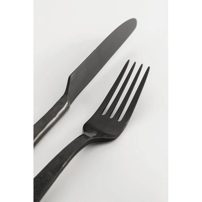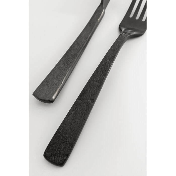 Purist elegance meets striking colours: this cutlery set in matt dark grey impresses with its unusual surface texture and modern lines. The cool tone lends every table an urban touch that is both elegant and contemporary. Thanks to its ergonomic design, each piece fits comfortably in the hand, while the chrome-plated stainless steel ensures robustness and durability. Whether for everyday use or special occasions, the ensemble blends stylishly into a variety of table settings. It is particularly impressive when paired with light-coloured porcelain plates or transparent glass accents.