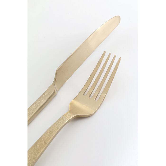A cutlery set that redefines moments of brilliance in gold: with a matt finish and fine texture, it looks modern, elegant and pleasantly understated. The ergonomic design ensures comfort at every meal, while the chrome-plated stainless steel guarantees durability and longevity. Whether for everyday use or festive occasions, this ensemble adds a stylish touch to any table setting. The golden hue unfolds particularly harmoniously in combination with simple ceramics, linen napkins or crystal glasses, transforming every table into an atmospheric arrangement.