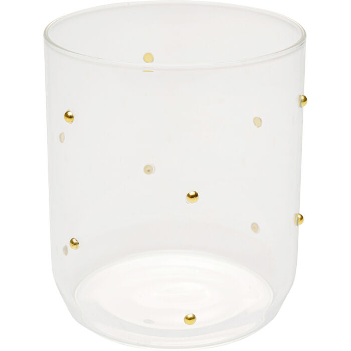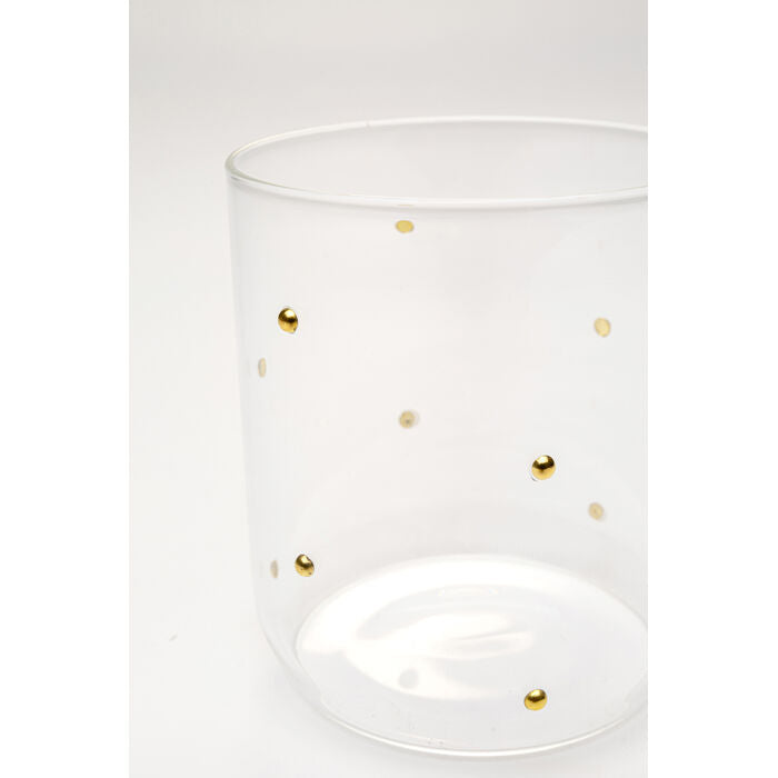 A real gem for the dining table - this drinking glass enchants with fine, golden dots that give the clear glass a gently glamorous touch. The delicate ornament shimmers discreetly in the light and turns every drink into a stylish moment of enjoyment. With its elegant look, the glass is suitable for both festive table settings and modern everyday settings. It looks particularly elegant in combination with linen, natural materials or accessories in brass or black. A small eye-catcher with a big impact - perfect for adding that certain something to the table.