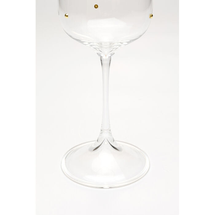 A real gem for the dining table - this drinking glass enchants with fine, golden dots that give the clear glass a gently glamorous touch. The delicate ornament shimmers discreetly in the light and turns every drink into a stylish moment of enjoyment. With its elegant look, the glass is suitable for both festive table settings and modern everyday settings. It looks particularly elegant in combination with linen, natural materials or accessories in brass or black. A small eye-catcher with a big impact - perfect for adding that certain something to the table.
