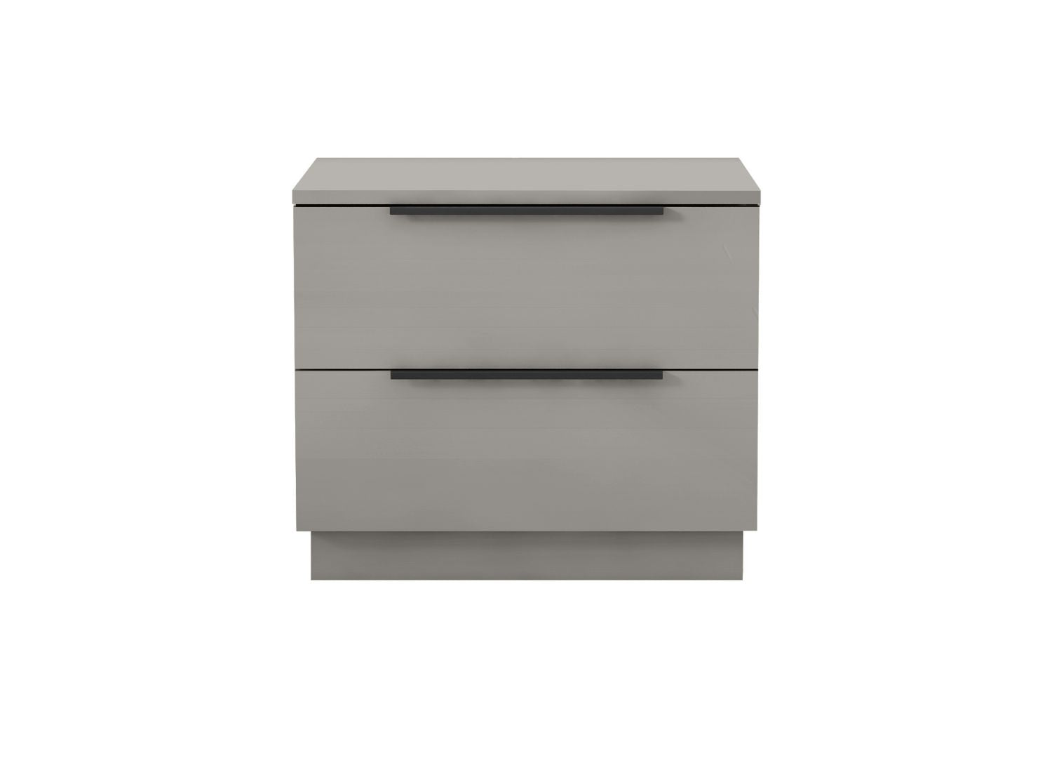 Damien Nightstand, High Gloss Light Grey, 2 Drawers with Self-Closing Runners and Matte Black Handles.