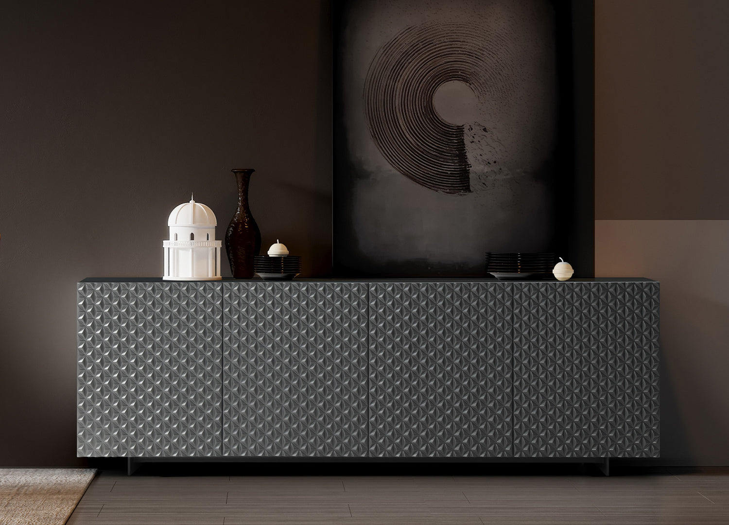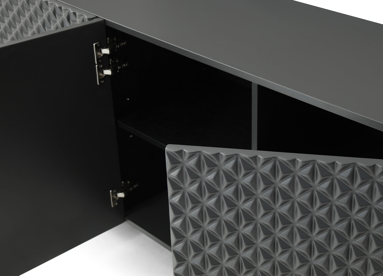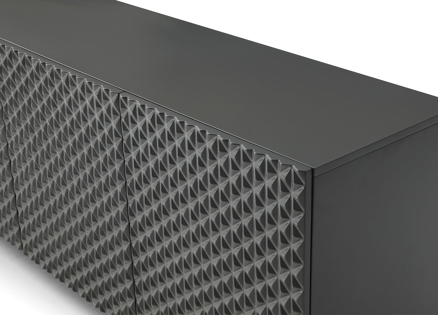 - Matt Dark Grey Lacquer, with 3D Door Cabinet Design, Base in Black Powder-Coated Steel.