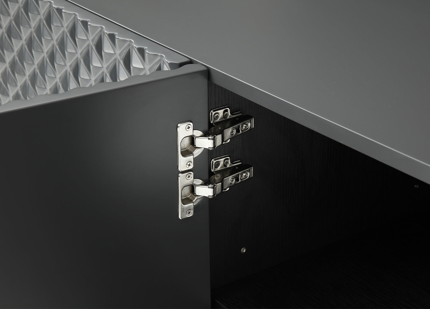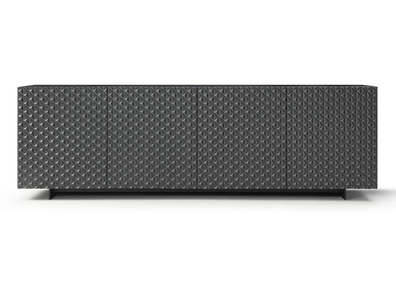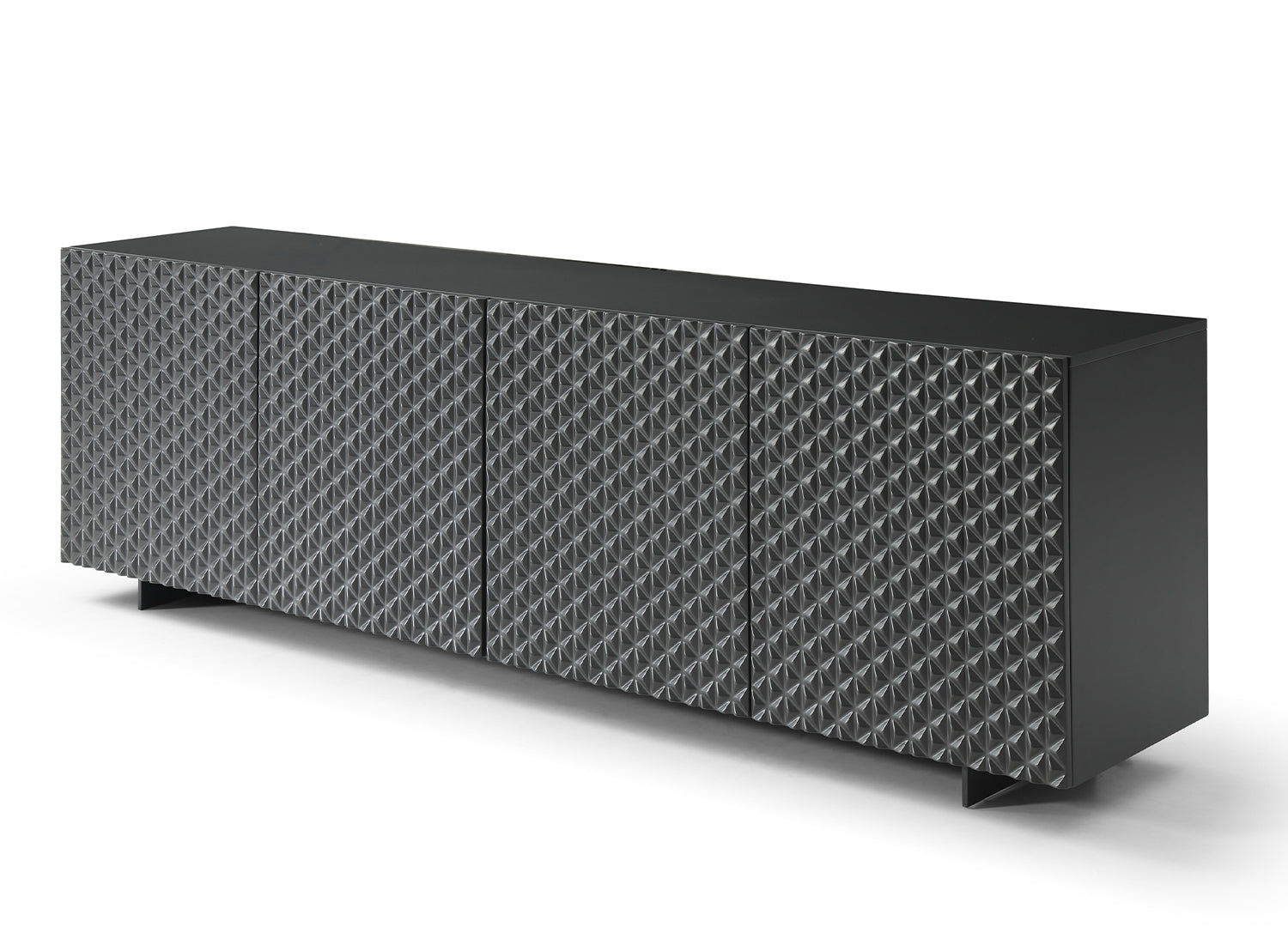 - Matt Dark Grey Lacquer, with 3D Door Cabinet Design, Base in Black Powder-Coated Steel.