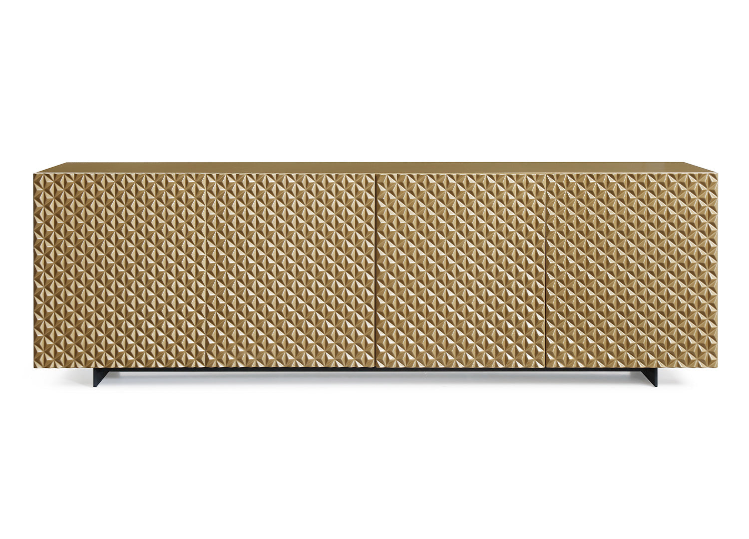 - High Gloss Gold Lacquer, with 3D Door Cabinet Design, Base in Black Powder-Coated Steel.Gold Harper Buffet is available in a smaller size.