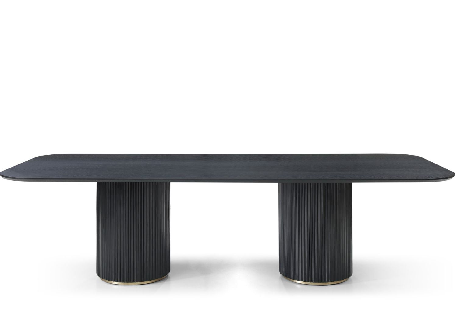 Heidi Rectangular Dining Table, Black Oak Veneer, Twin Pedestals Base with Ribbed Design and Bottom Brushed Brass Rings.