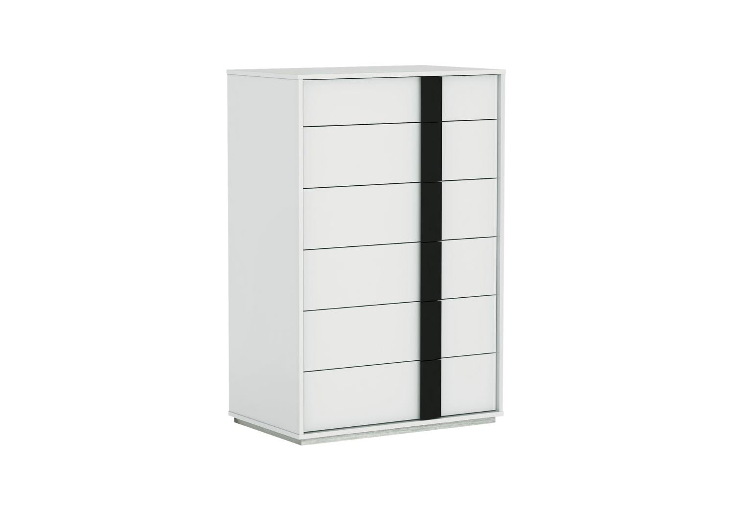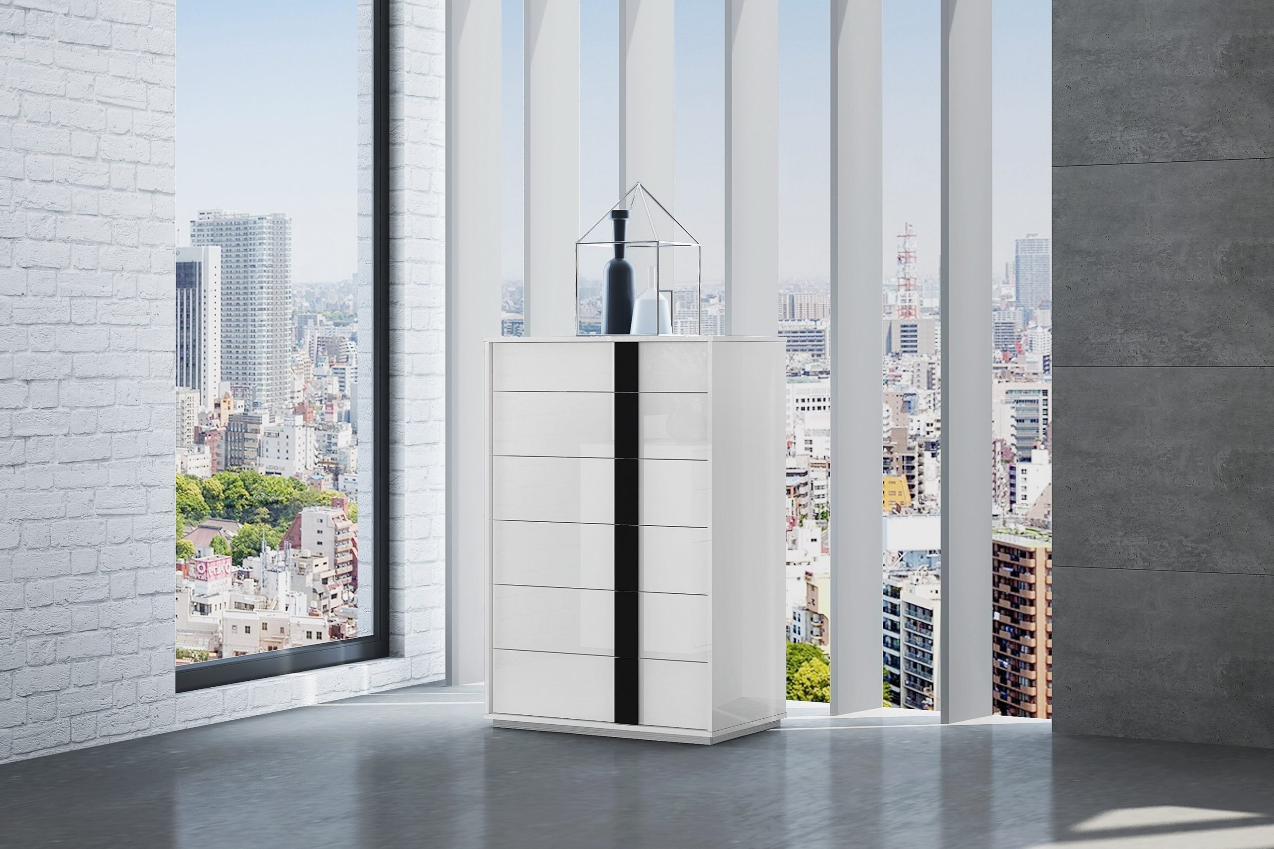 Kimberly Chest of drawers comes in high gloss white with self closing runners and matt black Handles.
