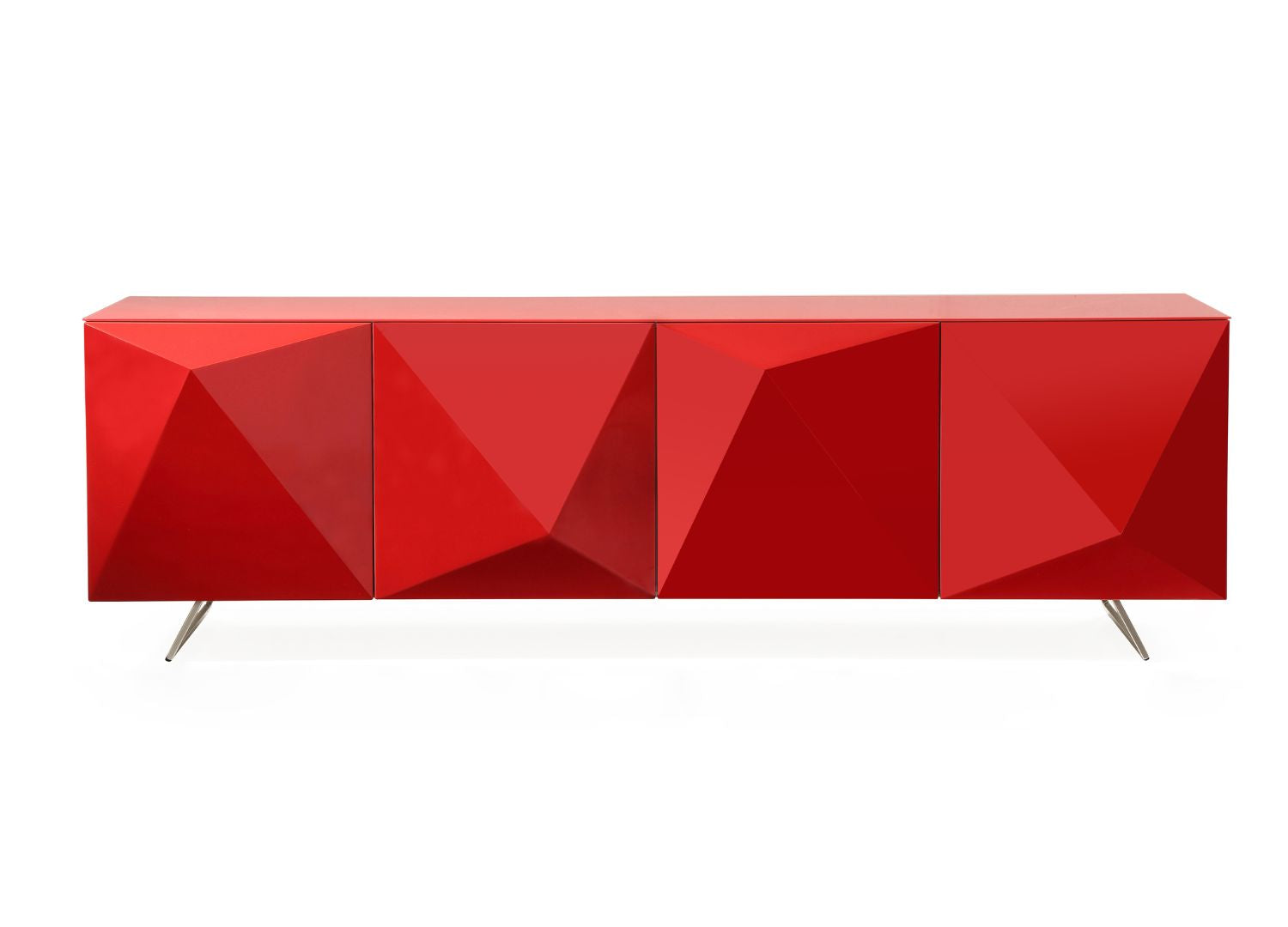 - High Gloss Red, Tempered Glass Top in Red, Cabinets Doors with Geometric Design, with Inside Shelves, Legs in Brushed Silver Nickel.