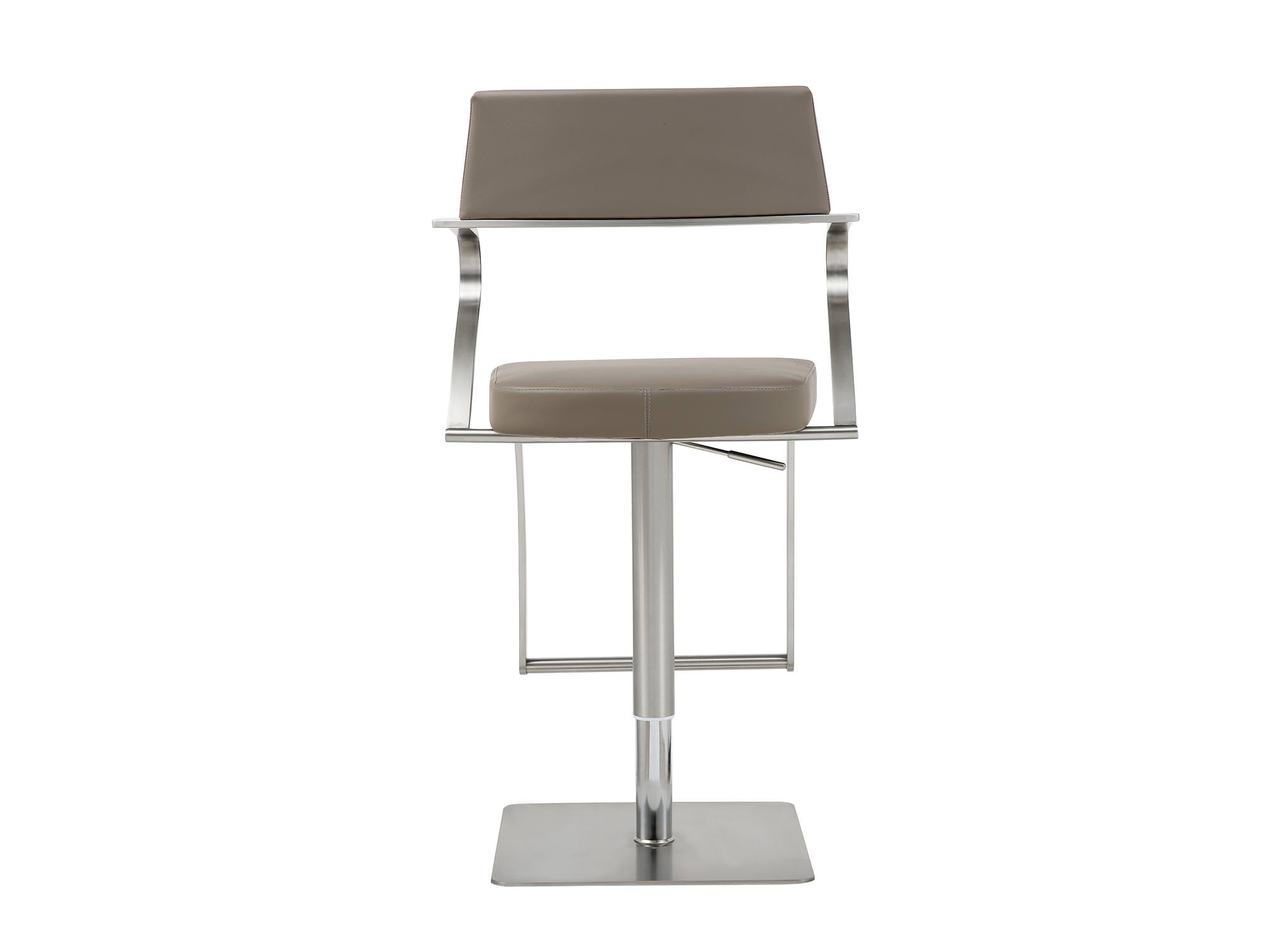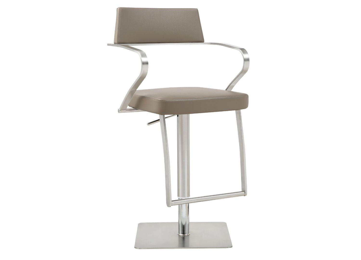 Zuri Barstool, Available in Taupe Faux Leather or in White Faux Leather, Adjustable Height with Gas Lift, Armrests and Silver Stainless Steel Square Base with Long Footrest.