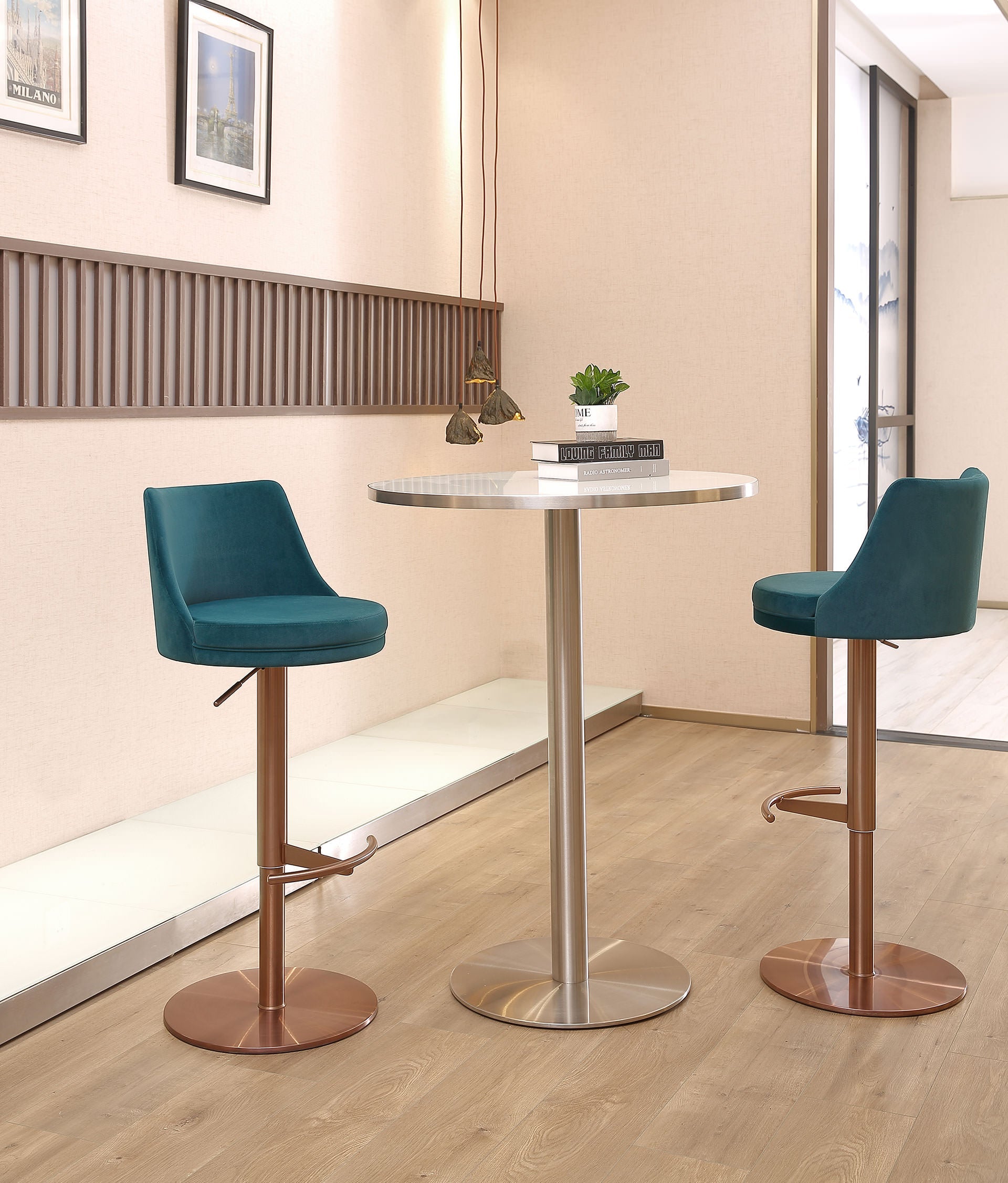 - Carter Barstool, in Light Grey Faux Leather, Adjustable Height with Gas Lift, Swivel Base in Brushed Stainless Steel, Silver Color.