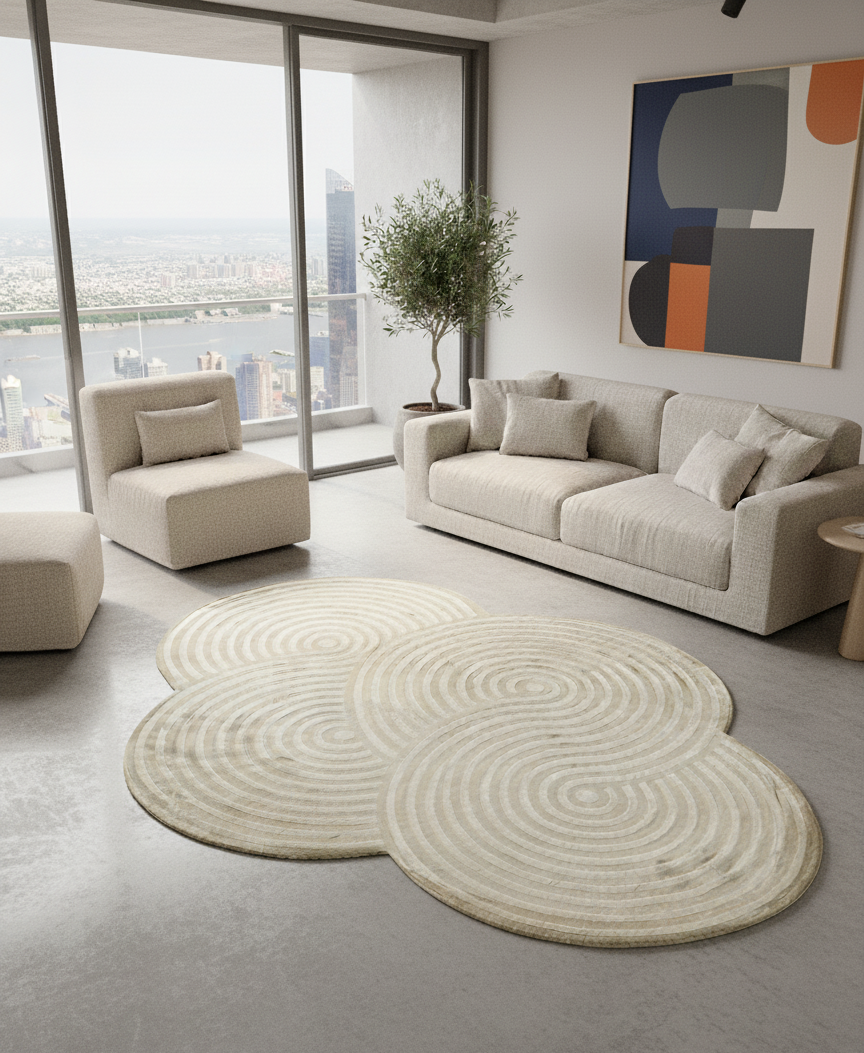 The Collette Rug features an abstract design of four interlinked circular forms, creating a harmonious and dynamic composition. Rendered in a refined nude palette, its subtle textures and soft tonal transitions bring elegance and visual interest, making it a sophisticated addition to contemporary living spaces or upscale hospitality interiors.