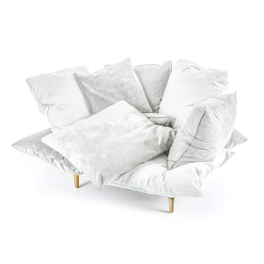 Oversize cushions become the sofa of excellence. A vision of outstanding comfort that becomes an aesthetic statement thanks to fabrics texture and shades of blue, white and black. A sofa and a chair to sink into. Armchair