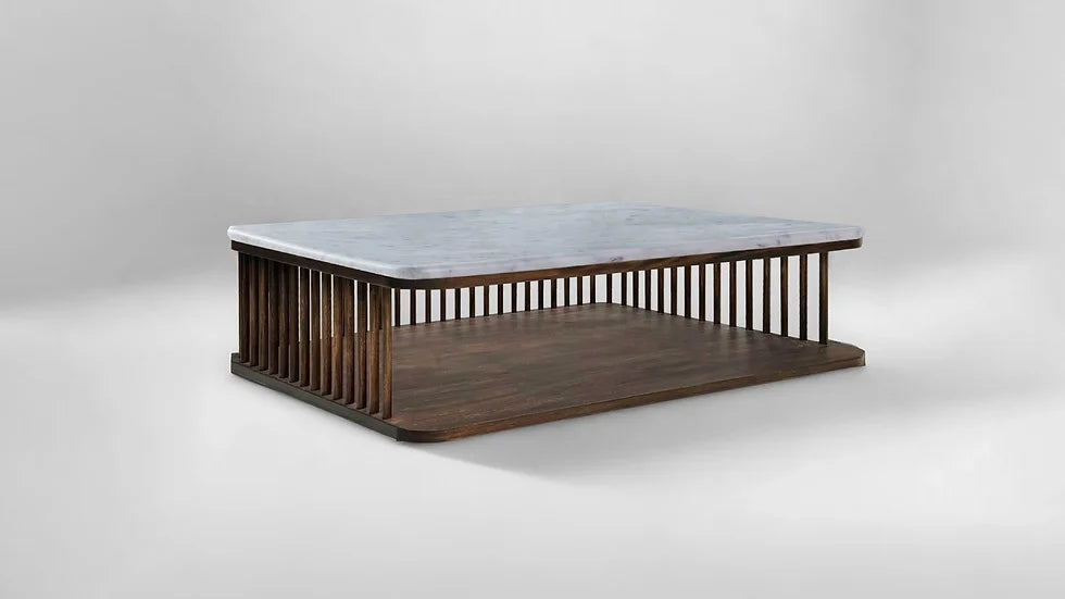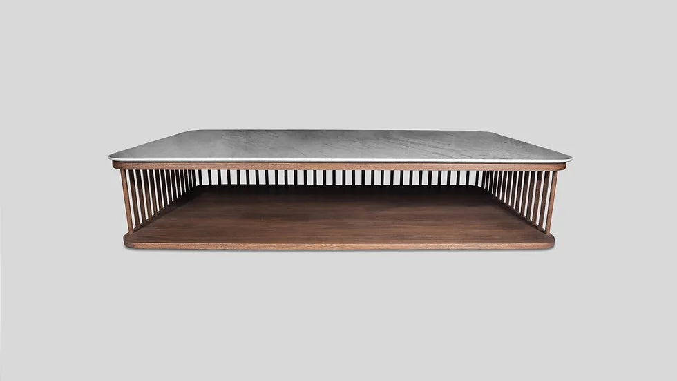 This coffee table from the 2021 Fénix collection symbolizes the rebirth of the home as a space of strength, wisdom, and prosperity. Designed by Sergio Vergara, it features a sophisticated marble top paired with a wooden structure of vertical lines, evoking solidity and fluidity. Every detail, from the carefully selected materials to its balanced forms, is designed to stimulate the senses and transform your home's interior into a source of resilience and beauty.