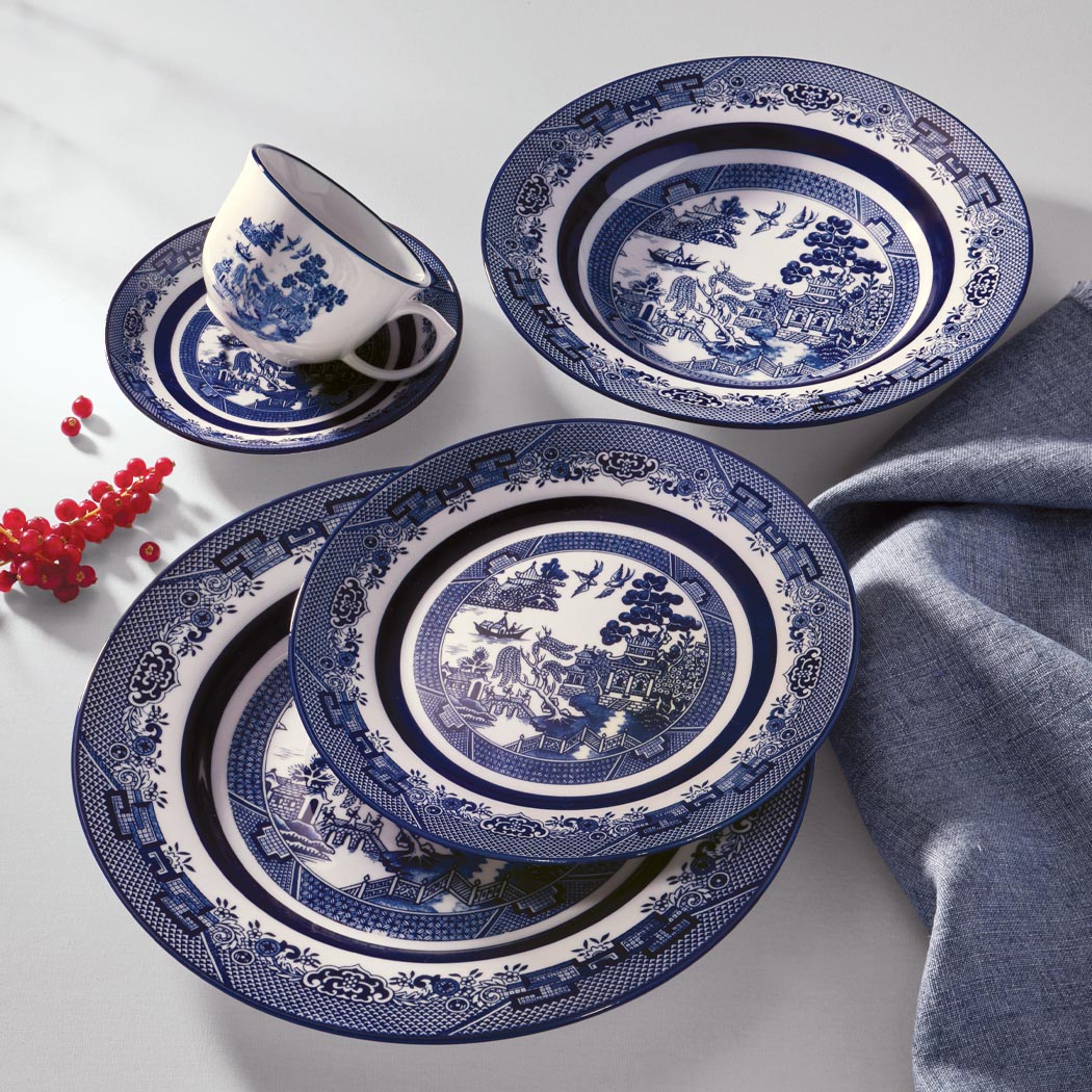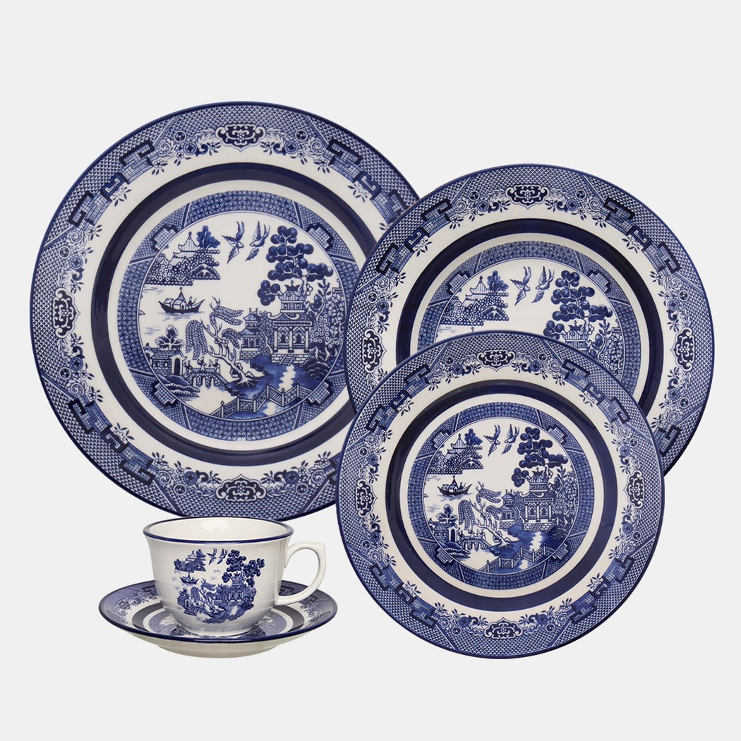 Oxford Flamingo, Blue Willow Porcelain 20 Piece Dinnerware Set, Service for 4