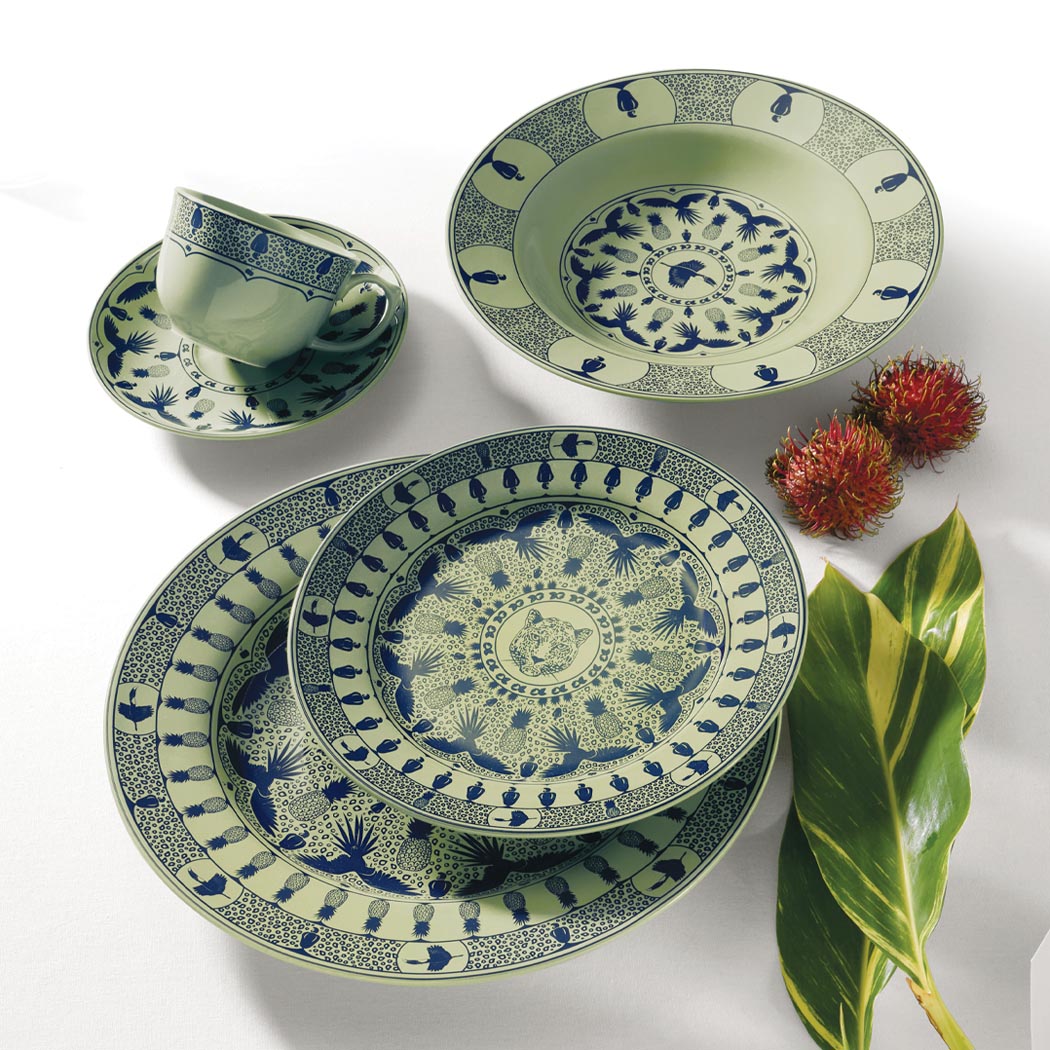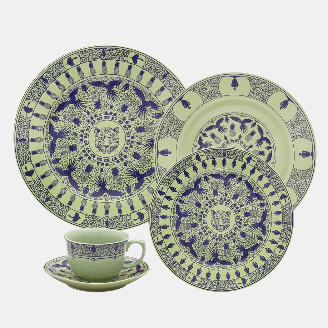 In this collection of Oxford Dinnerware, traditional porcelain meets Brazilian wildlife to create a captivating fusion. Named after the majestic flamingo and adorned with contrasting colors, these dinnerware sets are designed to make a statement with elegance. Their geometric patterns and depictions of flora and fauna create a sense of dynamism and vitality throughout each piece.